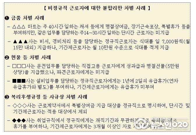 구체적으로 정규직과 동종・유사 업무에 종사하는 기간제・단시간・파견 근로자 등에게 합리적 이유 없이 ①식대・명절상여금 등을 지급하지 않은 금품 차별(18개소, 71백만 원), ②명절선물 등을 지급하지 않는 현물 차별(3개소) 등 적발된 사항에 대해 곧바로 시정 명령하여 전부 개선토록 했다.