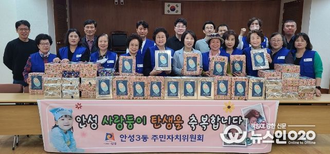(뉴스인020 = 김성길 기자) 안성시 안성3동 주민자치위원회는 지난 5월 11일 안성3동 주민센터에 출생신고를 하러 찾아오는 가정을 위해 출산축하용품(유아식기세트)을 기탁했다.
