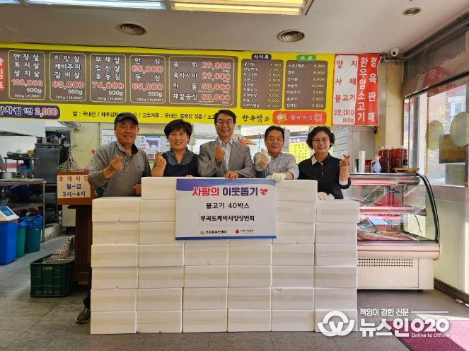 (뉴스인020 = 김성길 기자) 의왕시 부곡도깨비시장 상인회장인 박용술 대표가 23일 한우 소불고기와 국거리 세트 40박스를 부곡동주민센터에 기탁했다.