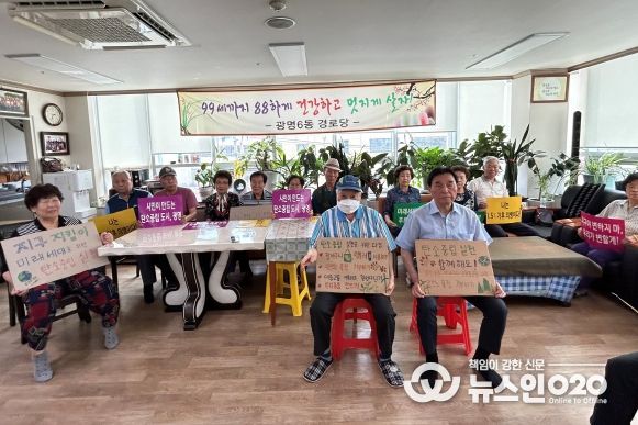 (뉴스인020 = 이한영 기자) 광명시 광명6동 경로당 회원들은 지난 5월 30일 미래 세대를 위한 ‘탄소중립 실천 캠페인’을 펼쳤다.