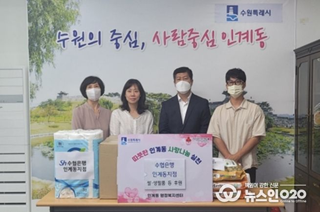 (뉴스인020 = 박용우 기자) Sh수협은행 인계동지점은 지난 2일 인계동 행정복지센터에 취약계층을 위한 쌀, 식품키트 등의 식료품과 생필품을 후원했다.