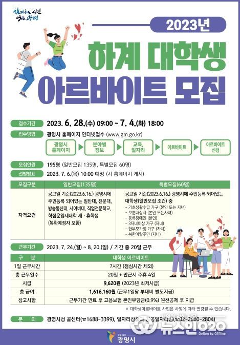 이번 여름방학 대학생 아르바이트 모집 대상은 광명시에 주민등록을 둔 대학생이며, 광명시 누리집(gm.go.kr)에서 신청하면 된다.