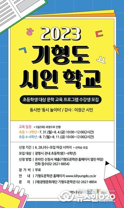 (뉴스인020 = 이한영 기자) 기형도문학관이 오는 28일부터 ‘2023년 기형도 시인 학교’ 초등학생 대상 문학 교육 프로그램에 참여할 수강생 모집에 나선다.