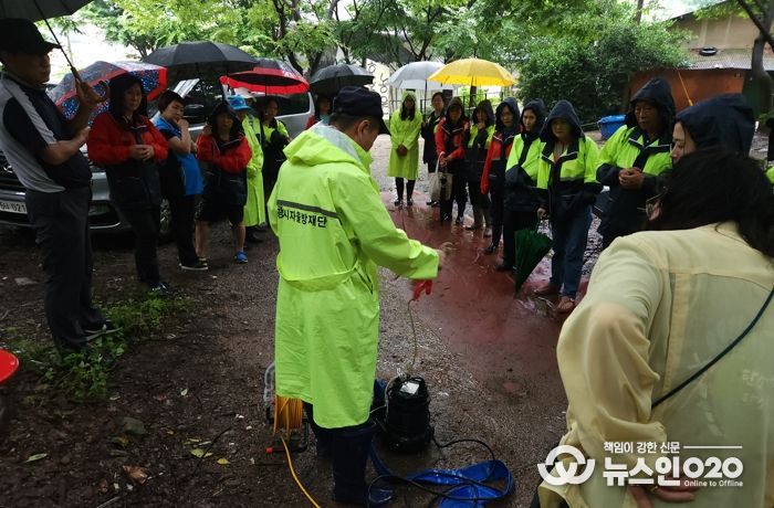 이날 구필회 광명시 자율방재단장이 수중펌프 작동법 시범을 보이며 주의사항을 전달했다. 이어 재난 상황에서 신속하고 올바르게 대응할 수 있는 역량을 키우기 위해 통장들이 수중펌프를 직접 작동해보며 사용법을 익혔다.