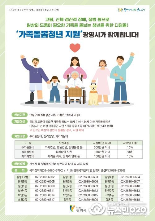 (뉴스인020 = 이한영 기자) 광명시는 고령·장애·질병 등으로 가족을 돌보는 청년들에게 ‘가족돌봄청년 지원사업’ 대상자를 모집한다.