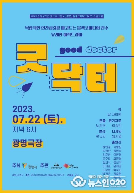 (뉴스인020 = 이한영 기자) 광명시 평생학습원에서 진행한'신중년, 삶을 ‘배우’다'에 참여한 신중년 학습자들이 오는 22일 토요일 오후 6시 광명극장에서 연극 ‘굿닥터’ 발표회를 가진다.