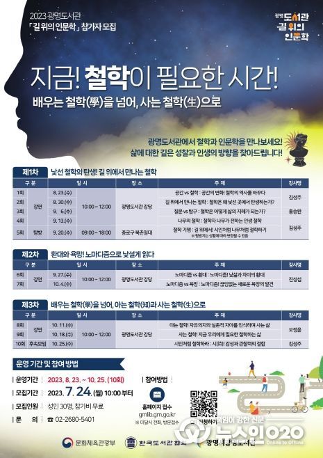 (뉴스인020 = 이한영 기자) 광명시 광명도서관은 오는 24일부터 '지금 철학이 필요한 시간_배우는 철학(學)을 넘어, 사는 철학(生)으로'를 주제로 도서관 ‘길 위의 인문학’ 수강생을 모집한다.