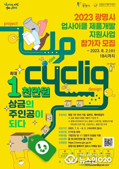 (뉴스인020 = 이한영 기자) 광명시 광명업사이클아트센터는 오는 8월 2일까지 업사이클 제품 및 서비스를 보유한 (예비)창업자를 지원하기 위한 ‘업사이클 제품개발 지원사업’의 참가자를 모집한다.
