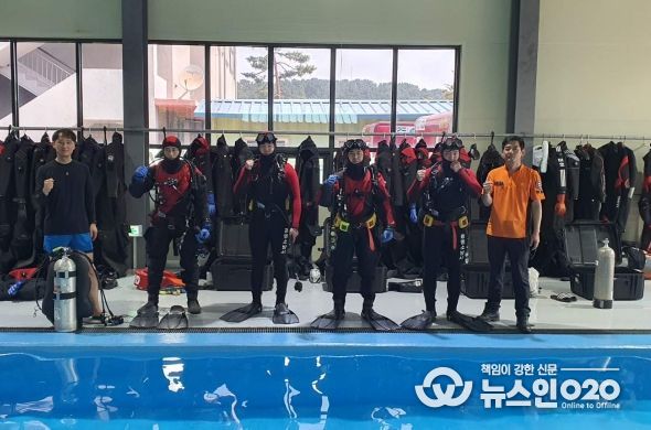 구조대장을 포함한 19명이 팀별로 3회에 걸쳐 시행된 이번 훈련에서는 현장활동 안전사고예방을 위한 위험예지 교육, 수난구조장비(드라이슈트 등) 점검 및 조작법 숙달, 2인1조 다이빙 숙달 훈련, 팀 단위 수중 인명검색 및 구조훈련 등 수난사고 발생 시 긴급구조대응 능력 향상에 중점을 두고 진행했다.