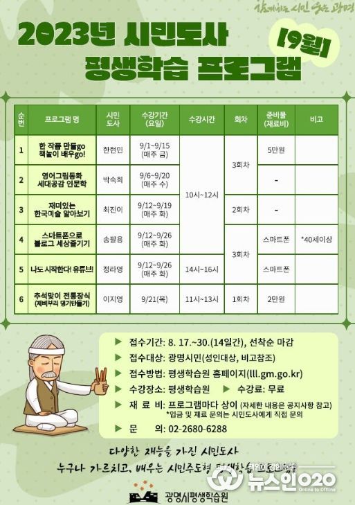(뉴스인020 = 이한영 기자) 광명시는 30일까지 ‘2023년 시민도사 평생학습 프로그램’ 9월 학습자를 모집한다.