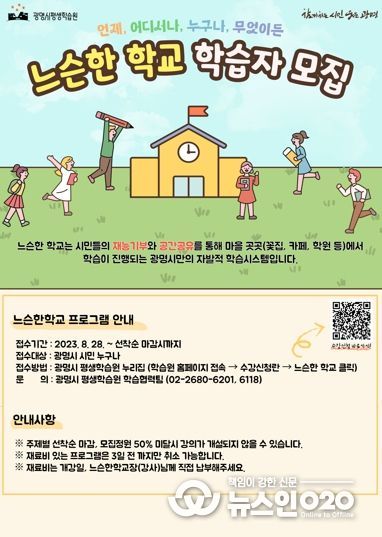 (뉴스인020 = 이한영 기자) 광명시는 오는 28일부터 ‘2023년 느슨한학교’ 프로그램 학습자를 모집한다.