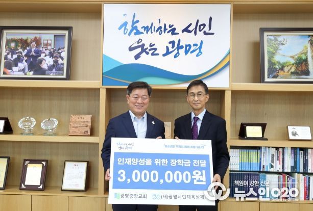 (뉴스인020 = 이한영 기자) 광명시인재육성재단(이사장 박승원)에 광명중앙교회에서 광명시 대학생들을 위해 장학금 300만 원을 기탁했다.