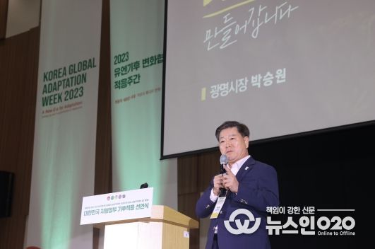 박승원 광명시장은 30일 오후 인천 송도 컨벤시아 그랜드볼룸에서 열린 ‘대한민국 지방정부 기후적응 선언식’에 참석해 기후적응 실천 선언문을 낭독하고 광명시 우수 정책사례를 발표했다.