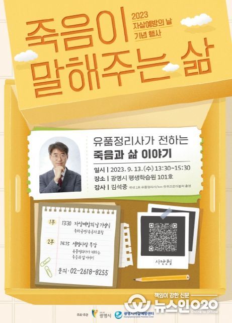 (뉴스인020 = 이한영 기자) 광명시 자살예방센터는 오는 13일 광명시평생학습원 1층 강당에서 2023년 세계 자살예방의 날 기념행사로 '죽음이 말해주는 삶' 특강을 진행한다.
