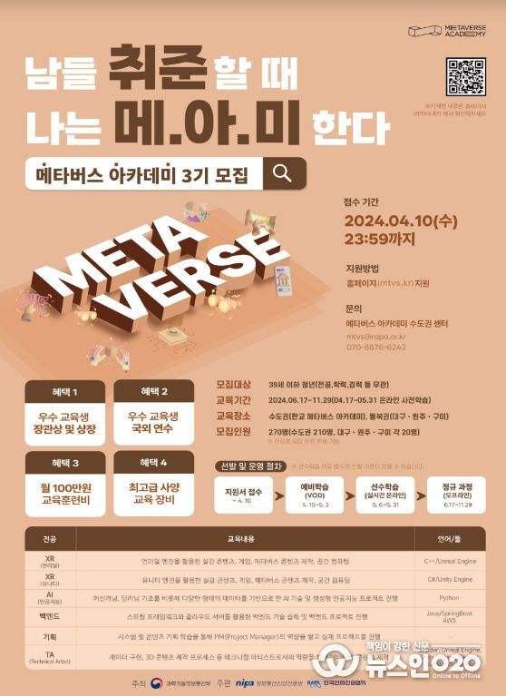 (뉴스인020 = 김나현 기자) 과학기술정보통신부는 메타버스(가상융합세계) 분야에 재능과 열정을 가진 청년들이 메타버스 산업을 이끌어 갈 개발자‧창작자로 성장하도록 지원하는 '메타버스 아카데미' 교육생을 4월 10일까지 공개 모집한다.