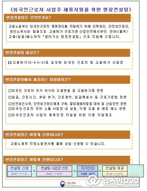 (뉴스인020 = 김성길 기자) 고용노동부는 외국인 근로자(E-9, H-2) 고용사업장을 직접 찾아 체류 관리를 지원하는 현장 컨설팅을 ‘24년 5월부터 12월까지 전국 지방노동관서에서 일제히 실시한다고 밝혔다.