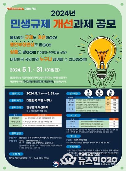 (뉴스인020 = 최정직 기자) 충남도는 행정안전부와 함께 일상생활 속 각종 불합리한 규제를 개선하기 위한 ‘2024 민생규제 개선과제 공모’를 실시한다고 6일 밝혔다.