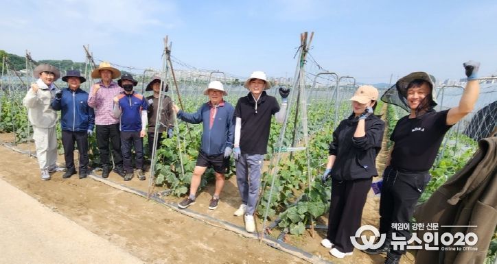 17일 아산시 배방읍 오이 농가를 찾은 사무소 직원 10여 명은 농촌인구 감소 및 고령화에 따른 인력 부족 등 농가의 어려움을 덜고 적기 영농을 지원했다.