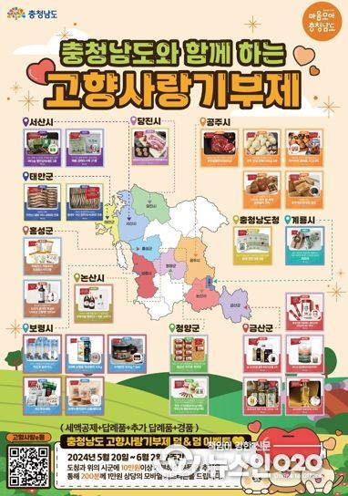 (뉴스인020 = 최정직 기자) 충남도는 5월 가정의 달을 맞아 오는 20일부터 다음달 2일까지 2주간 고향사랑기부제 1석 4조(세액공제+답례품+추가 답례품+경품)의 혜택을 받을 수 있는 ‘덤&덤’ 이벤트를 진행한다고 19일 밝혔다.
