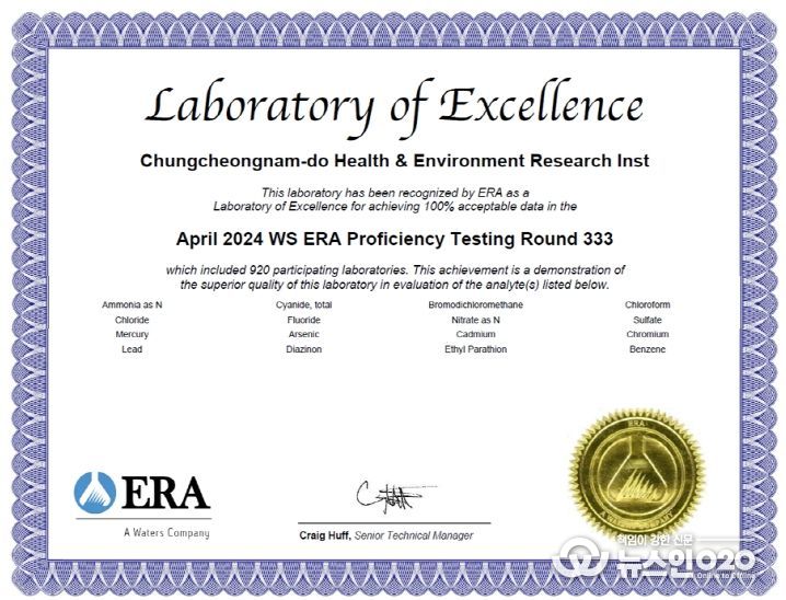 (뉴스인020 = 최정직 기자) 충남도 보건환경연구원은 미국 환경자원학회(ERA, Environmental Resource Associates)가 실시한 국제숙련도 시험에서 먹는물과 토양 분야 국제인증을 획득했다고 24일 밝혔다.