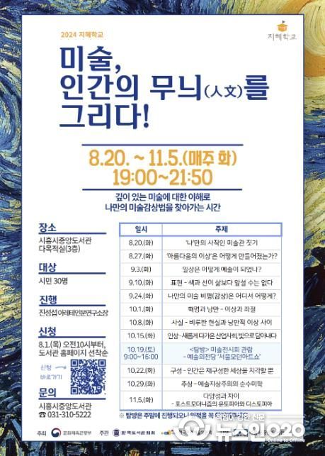 ‘도서관 지혜학교’는 인문학적 성찰을 통해 삶의 지혜를 체득하는 강좌로, 시흥시중앙도서관은 ‘미술’을 주제로 한 인문학 프로그램을 운영한다. 강의는 진성섭 아레테인문연구소장이 맡아 8월 20일부터 11월 5일까지 매주 화요일 저녁 7시부터 3시간 동안 총 12회에 걸쳐 진행된다.