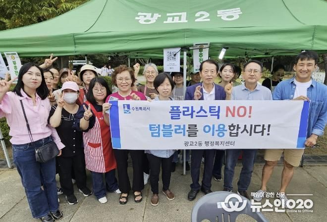 (뉴스인020 = 박용우 기자) 수원시 영통구 광교2동은 지난 28일 수원재즈페스티벌 행사장에서 단체원들과 함께 1회용품 줄이기 캠페인을 실시했다.