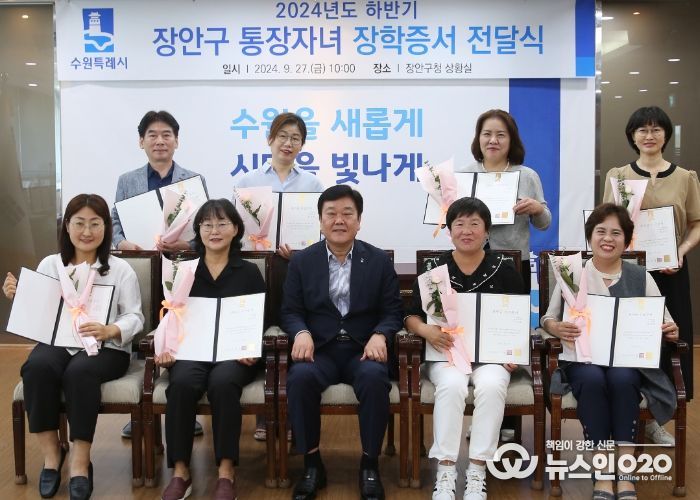 (뉴스인020 = 박용우 기자) 수원시 장안구는 지난 27일, 장안구청 상황실에서 2024년 하반기 통장자녀 장학증서 전달식을 개최했다.