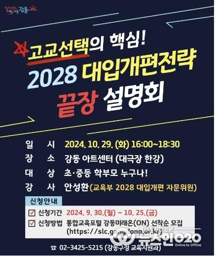 (뉴스인020 = 박용우 기자) 강동구는 2024 강동 교육주간(10월 28일~11월 1일)을 맞아, 변화하는 입시전형 속에서 초중등 학부모들의 고민을 덜어주기 위해, 10월 29일 강동아트센터에서 ‘2028 대입개편전략 끝장 설명회’를 개최한다고 밝혔다.