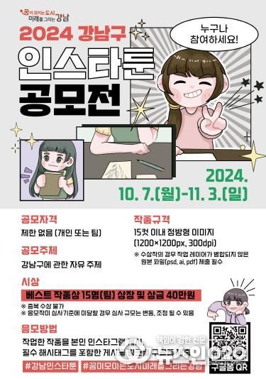 조성명 강남구청장은 “이번 인스타툰 공모전이 강남구의 정책과 매력을 창의적으로 알리는 계기가 되길 바란다”며 “앞으로도 구민들이 직접 참여할 수 있는 다양한 홍보 콘텐츠 공모전을 통해 강남의 이야기를 널리 알리고 소통할 수 있는 기회를 확대하겠다”고 밝혔다.
