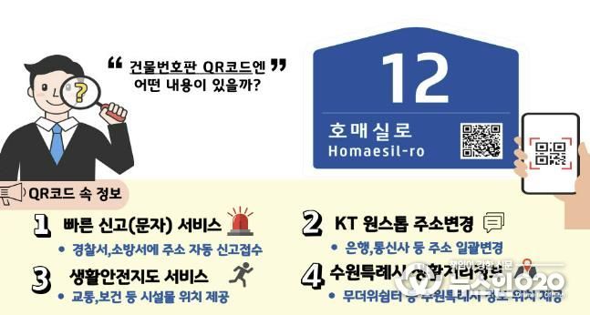 (뉴스인020 = 박용우 기자) 수원시 권선구는 시민들에게 생활·안전·복지 등 유용한 정보를 건물번호판 QR코드로 제공하는 고도화된 주소정보서비스를 도입하고 있다고 밝혔다.