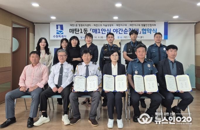 (뉴스인020 = 박용우 기자) 수원시 영통구 매탄1동은 지난 8일, 매탄136 자율방범대, 매탄지구대, 매탄지구대 생활안전협의회과 함께 '매1안심 야간순찰대'사업 업무협약(MOU)을 체결했다.