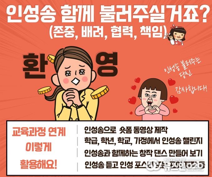 학교에서는 1교 1인성 브랜드, 교육과정과 연계해 ▲인성송으로 여는 수업 ▲학교와 가정을 연계한 인성송 챌린지 ▲학생자치회 주관 인성송 행사 등 자율적으로 활용할 수 있다.