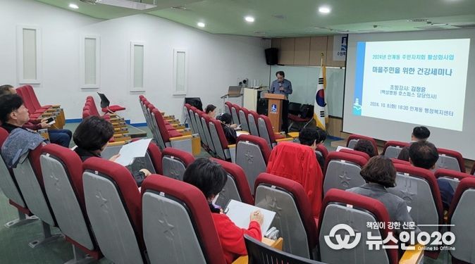 (뉴스인020 = 박용우 기자) 수원시 팔달구 인계동 주민자치회는 지난 8일 오후 6시 30분부터 인계동 행정복지센터 2층 대회의실에서 '마을주민을 위한 건강세미나'를 진행했다.