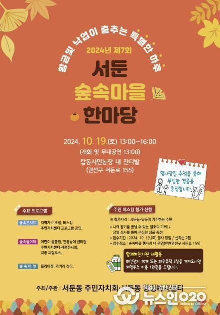 (뉴스인020 = 박용우 기자) 수원시 권선구 서둔동은 서둔동 주민자치회 주관으로 오는 19일 토요일 탑동시민농장에서 ‘제7회 서둔 숲속마을 한마당’을 개최한다.