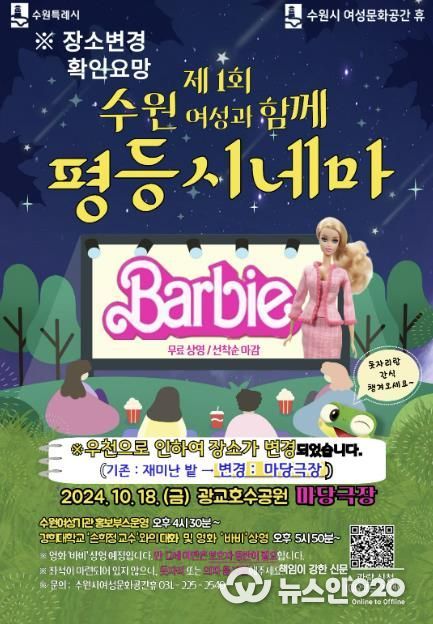 (뉴스인020 = 박용우 기자) 수원시 여성문화공간-휴(休)가 18일 양성평등 문화확산을 위한 시민 참여 프로그램 ‘제1회 수원여성과 함께 평등시네마’를 광교호수공원 마당극장에서 연다.