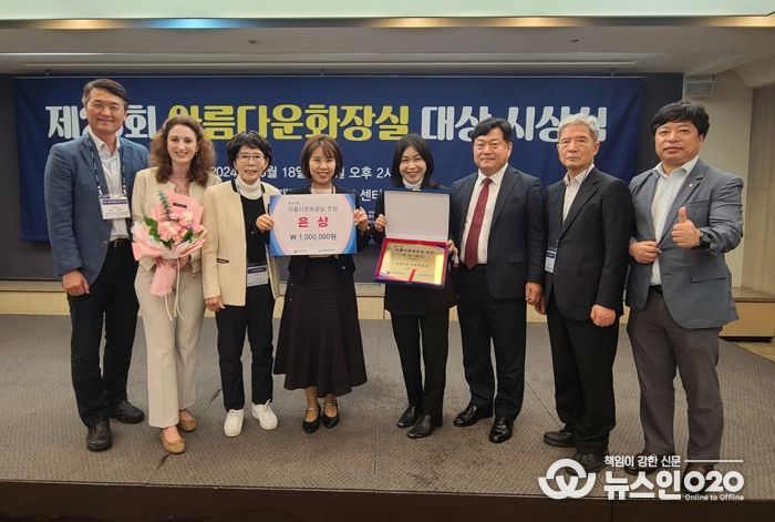(뉴스인020 = 박용우 기자) 수원 서호공원 ‘낙조 화장실’이 행정안전부·(사)한국화장실문화협회가 공동 주최하는 제26회 아름다운화장실 大賞(대상) 공모에서 은상(행정안전부장관상)으로 선정됐다. 시상식은 18일 서울 중구 한국프레스센터에서 열렸다.
