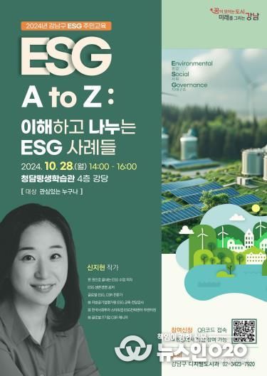 (뉴스인020 = 박용우 기자) 꿈이 모이는 도시, 미래를 그리는 강남구는 28일 오후 2시부터 4시까지 청담평생학습관 4층 강당에서 구민 150여 명을 대상으로 ESG 특강을 개최한다.
