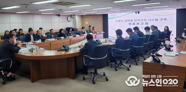 수원시는 21일 시청 재난안전상황실에서 김현수 제1부시장 주재로 ‘수원시 모바일 전자고지 시스템 구축용역 완료보고회’를 열고, 서비스 도입 계획을 논의했다.