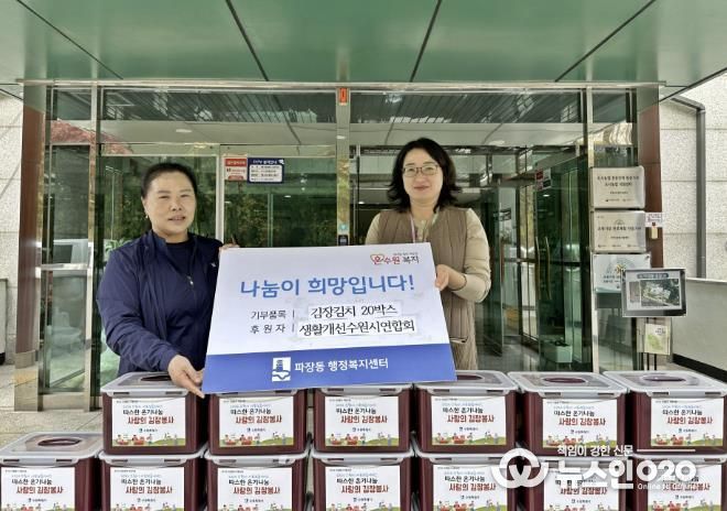 (뉴스인020 = 박용우 기자) 생활개선수원시연합회는 지난 14일, 수원시 장안구 파장동 행정복지센터에 김장김치 20통을 전달하며 어려운 이웃을 위한 따뜻한 나눔을 실천했다. 이번 김장김치는 파장동 내 어려운 주민들에게 전달될 예정이다.