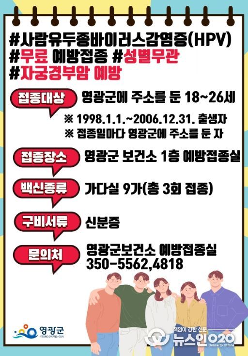 (뉴스인020 = 김성길 기자) 영광군은 18∼26세(1998. 1. 1. 부터 2006. 12. 31. 출생자) 군민 대상으로 사람유두종바이러스(HPV) 무료 예방접종을 실시하고 있다고 밝혔다.