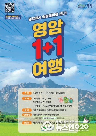 (뉴스인020 = 김성길 기자) 영암군이 이달 말일부터 올해 말까지 2인 이상 관광객에게 최대 24만원의 지역화폐 등을 주는 ‘영암여행 원플러스원(1+1)’ 사업을 진행한다.