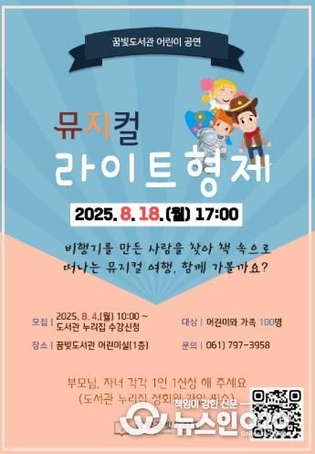 (뉴스인020 = 김성길 기자) 광양꿈빛도서관은 오는 8월 18일 오후 5시, 어린이실에서 어린이와 가족 100명을 대상으로 ‘뮤지컬 라이트 형제’ 공연을 운영한다고 밝혔다.