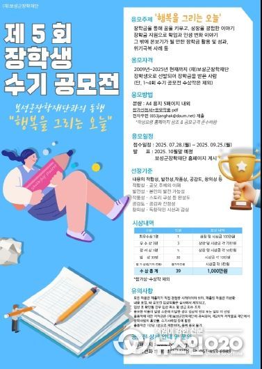 (뉴스인020 = 김성길 기자) 보성군은 오는 9월 25일까지 (재)보성군장학재단(이사장 문찬오)이 개최하는 ‘제5회 장학생 수기 공모전’의 참여자를 모집한다고 밝혔다.