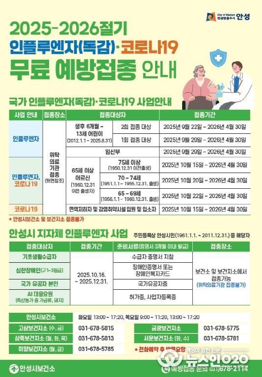 (뉴스인020 = 김성길 기자) 안성시보건소는 오는 22일부터 내년 4월30일까지 지역 내 75개소 의료기관에서 인플루엔자 3가 백신 무료 예방접종을 실시한다고 밝혔다.