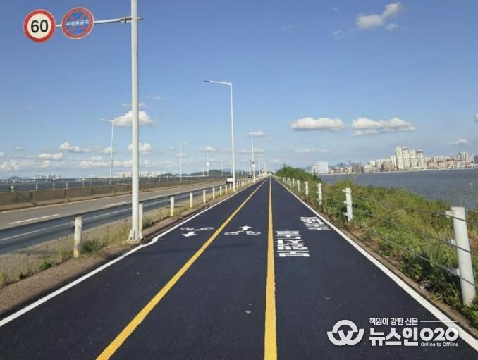 (뉴스인020 = 김성길 기자) 시흥시는 지난 9월 8일부터 18일까지 시화호 방조제 자전거도로 3.8km 구간에 대한 재포장 및 도색 정비 공사를 완료했다.