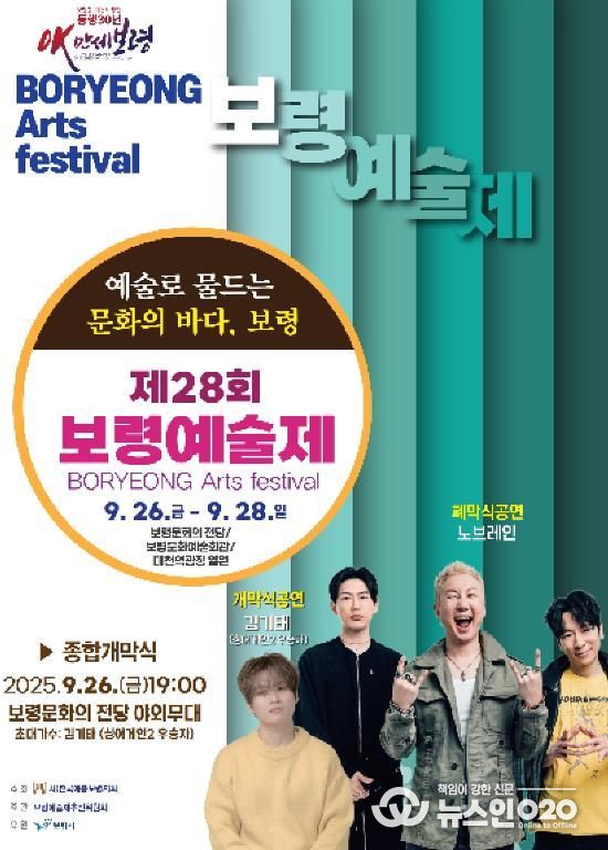 (뉴스인020 = 김성길 기자) 한국예술문화단체총연합회 보령지회는 제28회 보령예술제를 9월 26일부터 28일까지 3일간 개최한다. ‘예술로 물드는 문화의 바다, 보령!’이라는 슬로건으로 보령 문화예술의 르네상스를 열기 위해 보령문화의전당, 대천역 광장 특설무대, 보령문화예술회관에서 진행된다.