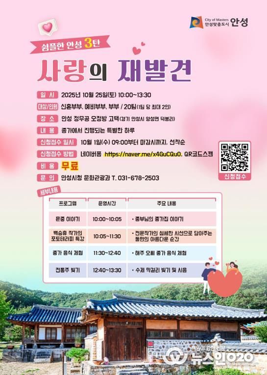 (뉴스인020 = 김성길 기자) 안성시는 오는 10월 25일 오전 10시부터 오후 1시 30분까지 양성면 덕봉리에 위치한 안성 정무공오정방고택(경기도 유형문화유산)에서 '쉼플한 안성 3탄, 사랑의 재발견'을 운영한다.
