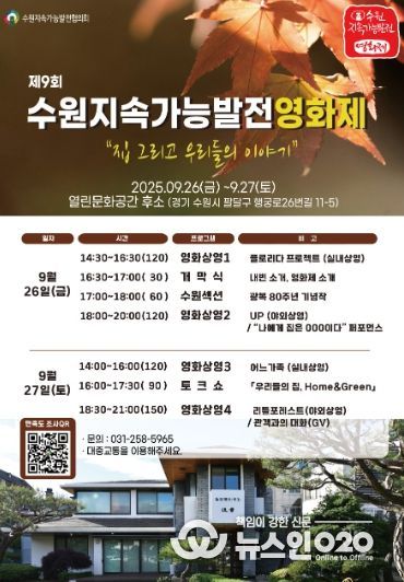 (뉴스인020 = 기자) 제9회 수원지속가능발전영화제가 9월 26~27일 열린문화공간 후소에서 열린다. 올해 주제는 ‘집, 그리고 우리들의 이야기’다.