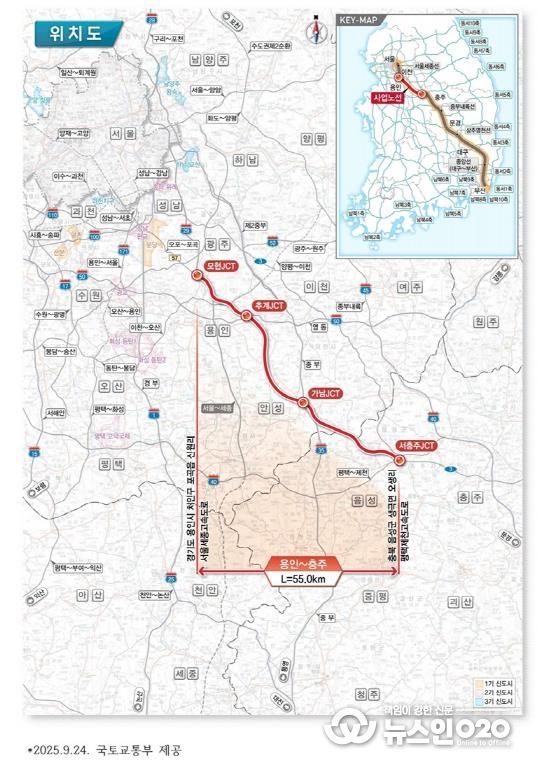 국토교통부에 따르면 안성과 용인-음성-충주를 연결하는 민자고속도로는 손익 공유형(BTO-a) 방식으로 추진되며, 총연장 약 55km, 왕복 4차로, 설계속도는 시속 110km