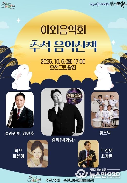 (뉴스인020 = 김성길 기자) 순천시 문화예술회관은 추석 명절을 맞아 시민과 관광객을 위한 야외음악회 '추석 음악산책'을 10월 6일 추석 당일 오후 5시에 오천그린광장에서 개최한다고 밝혔다.
